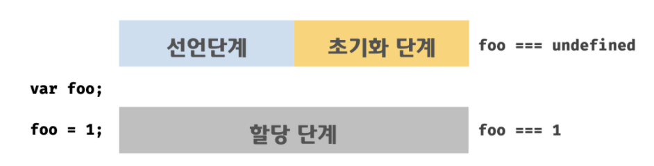 var 키워드로 선언한 변수는 런타임 이전에 자바스크립트 엔진에의해 암묵적으로 "선언단계" 와 "초기화 단계"가 한번에 진행된다.